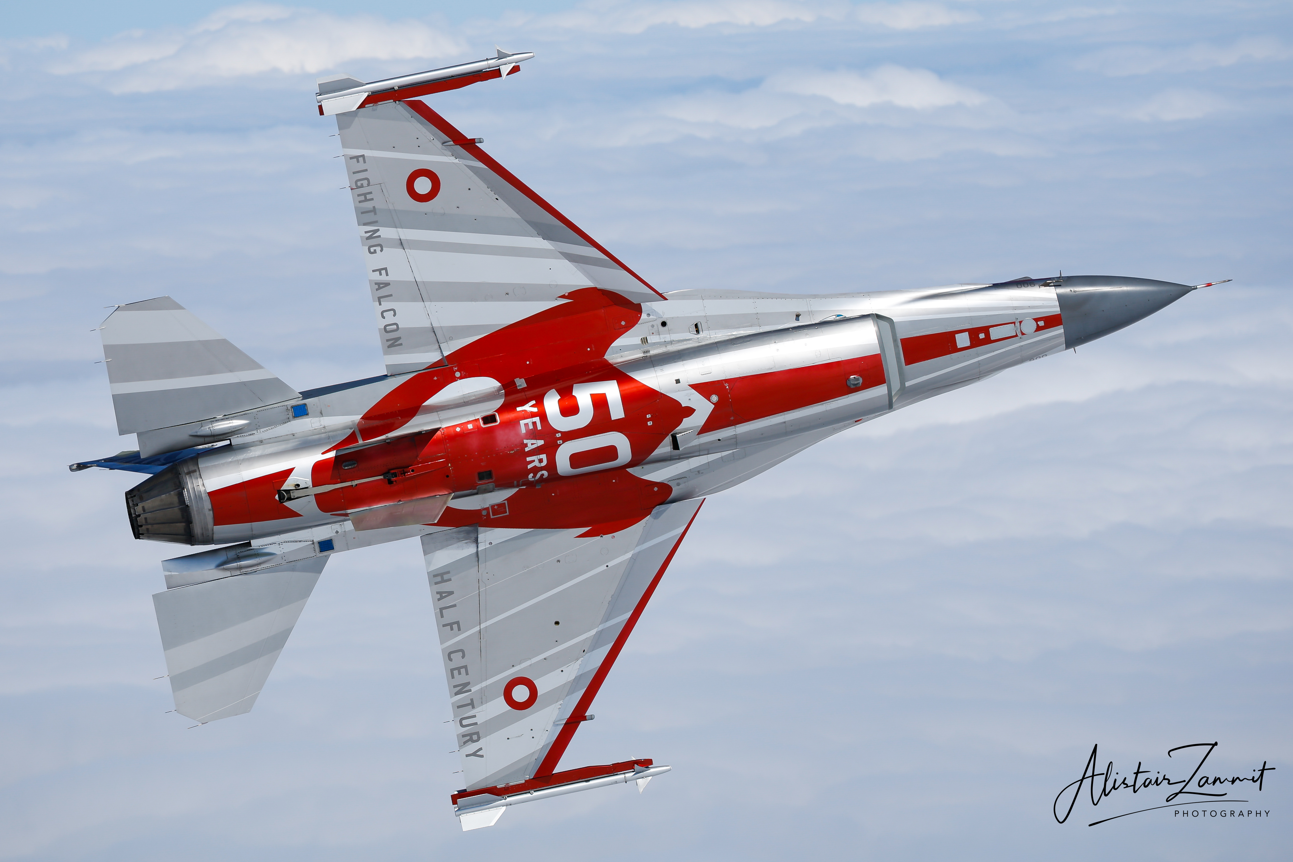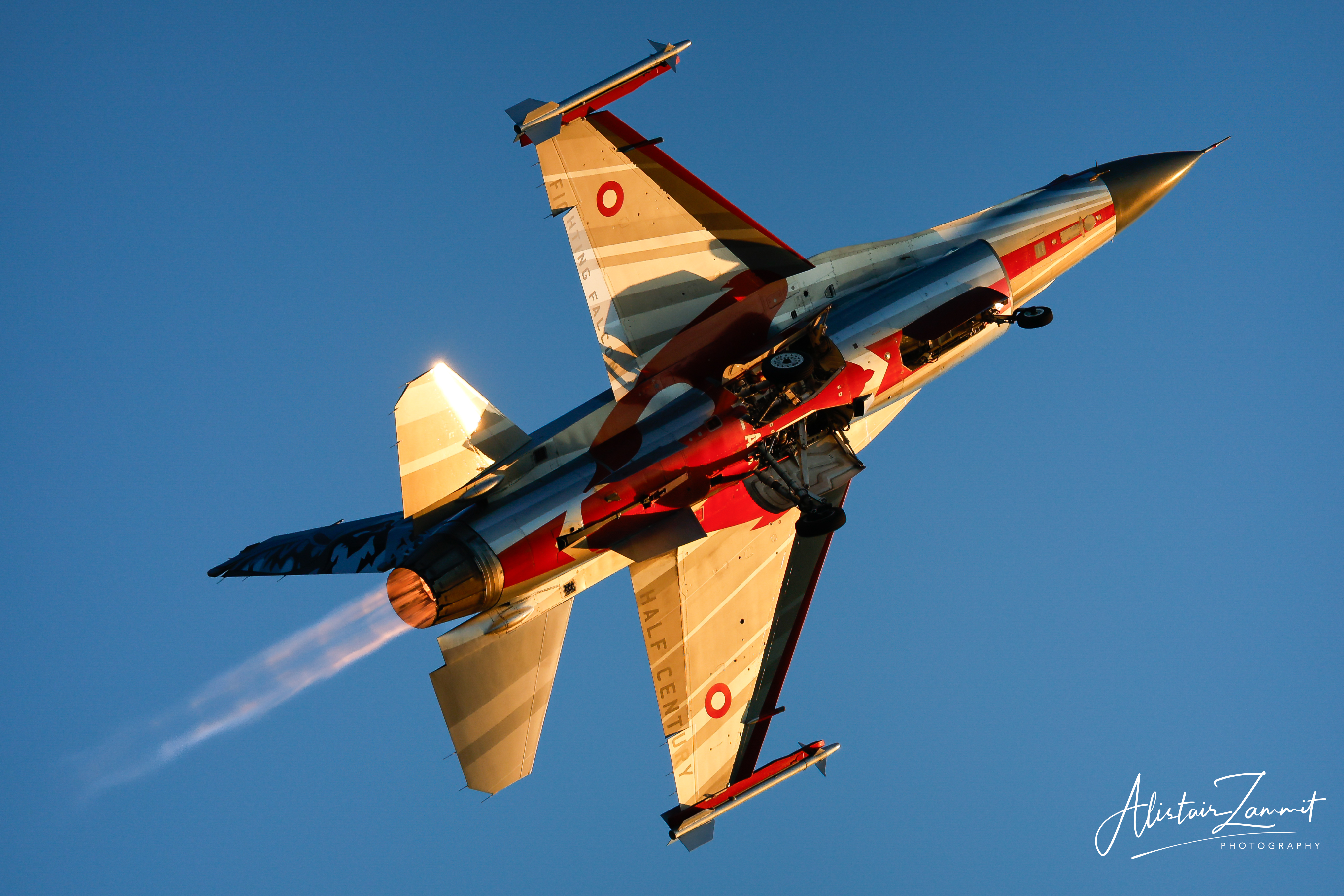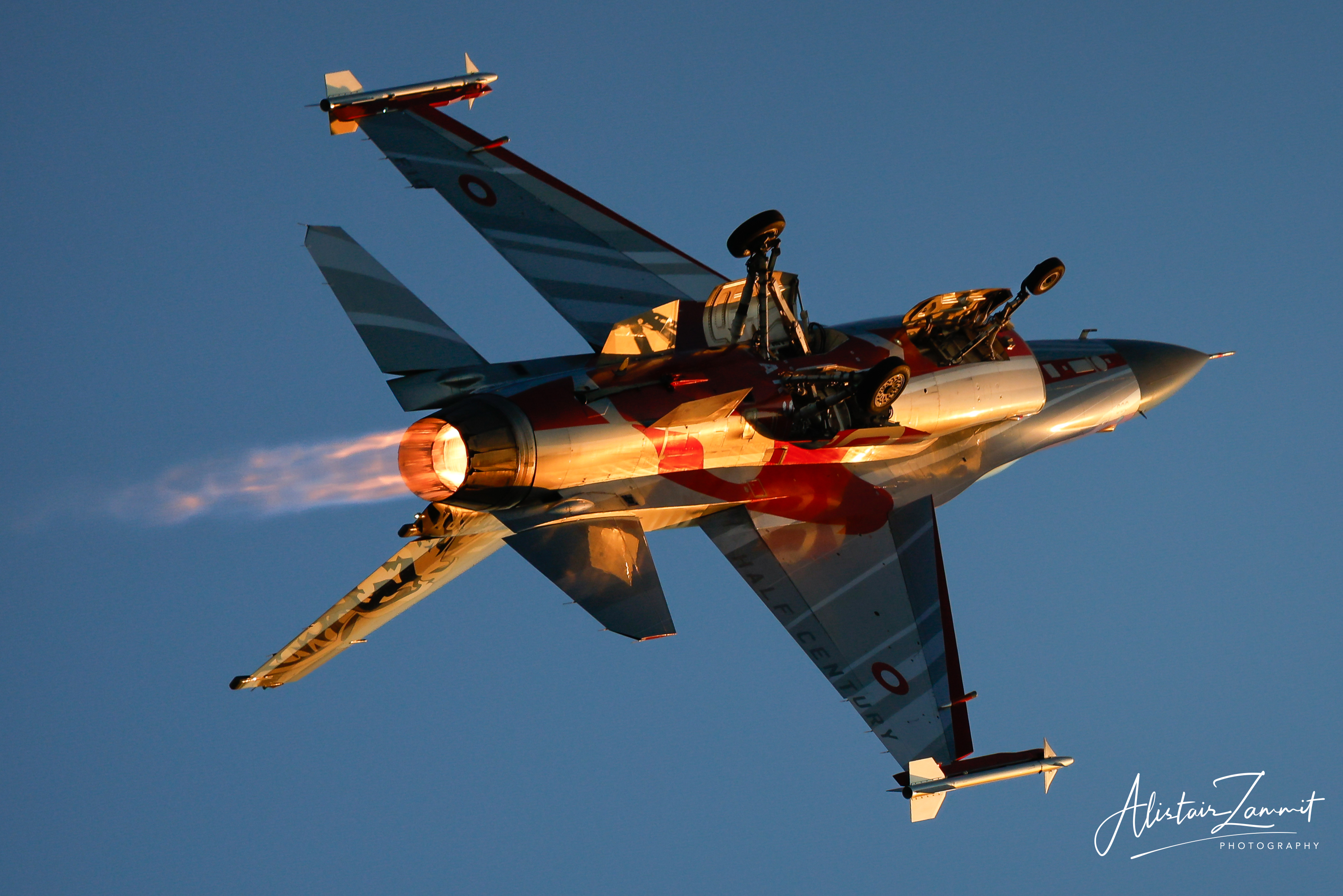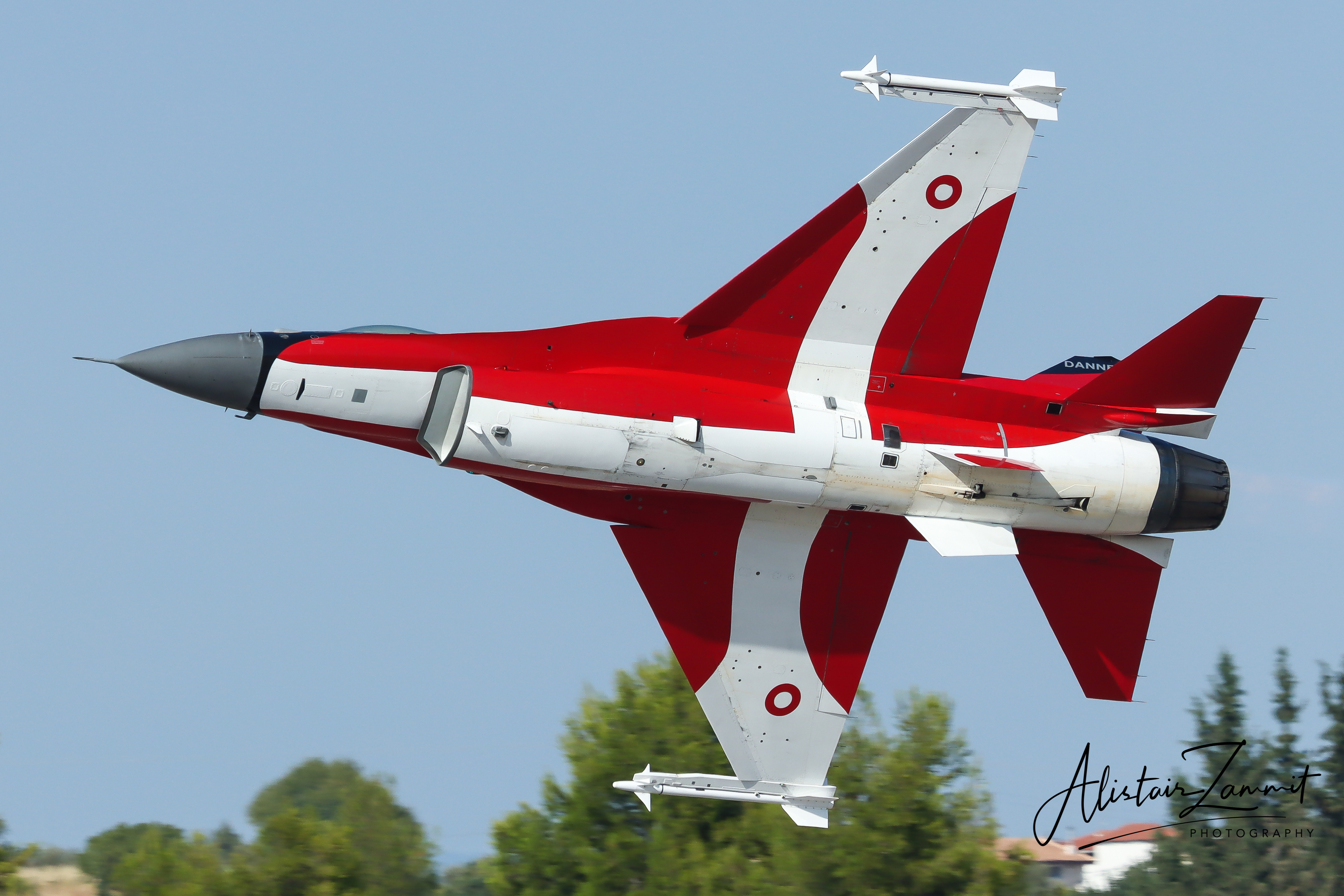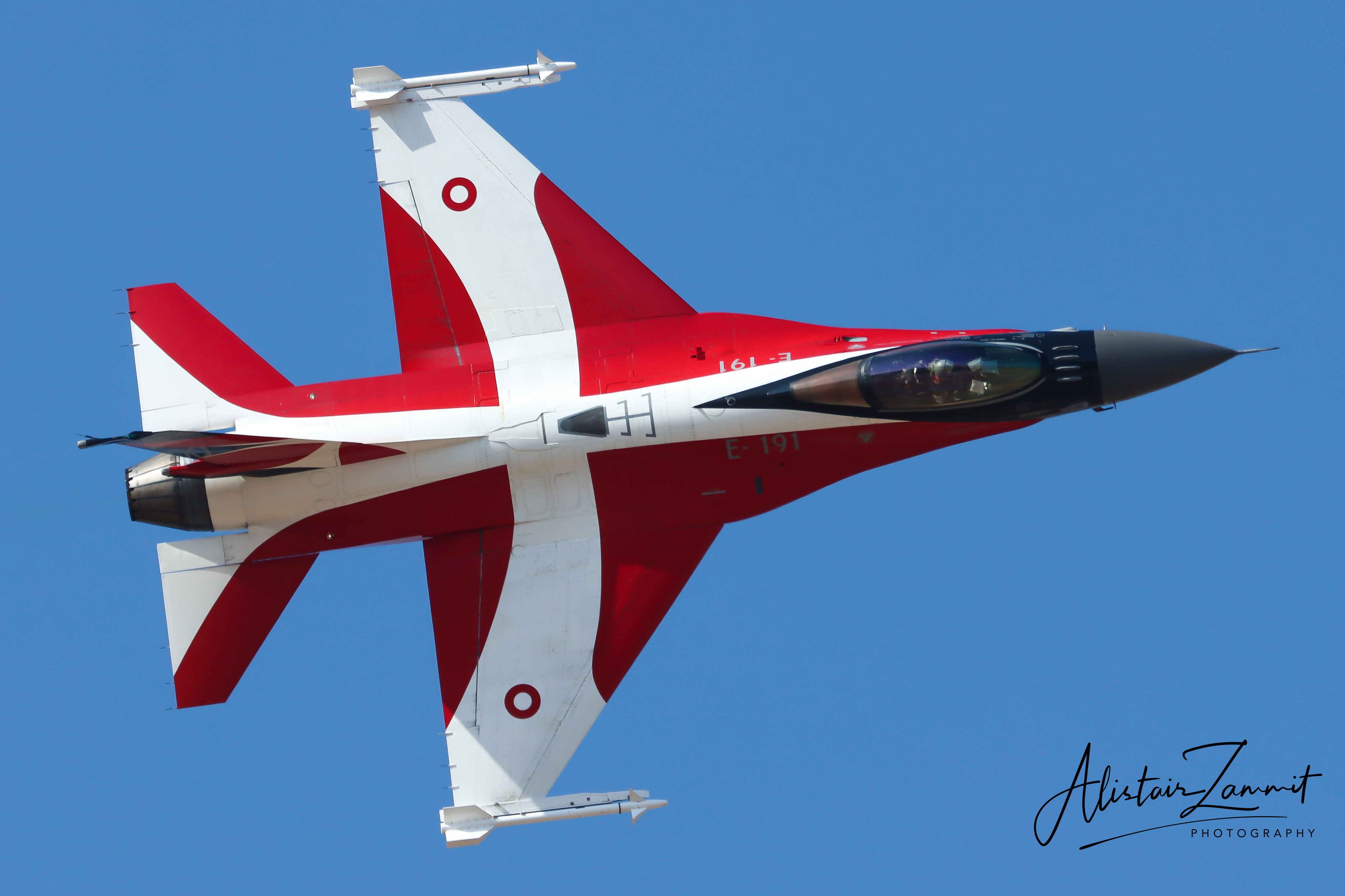 Over the years, the F-16 Demo team frequently flew in commemorative or national paint schemes, especially the well-known red-and-white Dannebrog livery, transforming the fighter into a crowd favourite at airshows across Europe. High-G turns, dramatic vertical climbs, precision rolls, and high-alpha passes became trademarks of the Danish routine, each flown to tight timing and safety constraints.