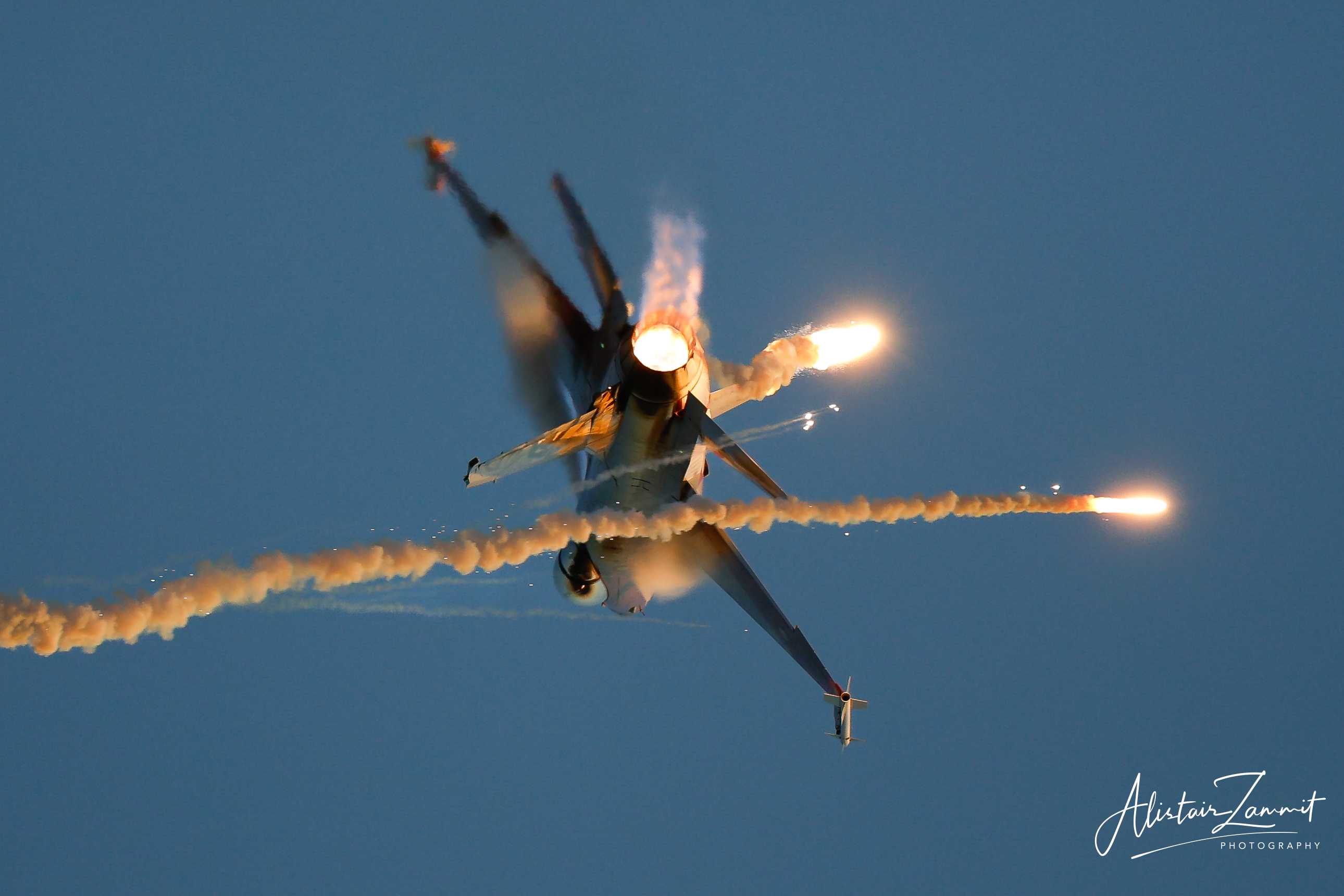 Utilising FLCS-managed pitch authority to operate deep into the high-lift region while maintaining directional stability visible to the crowd.